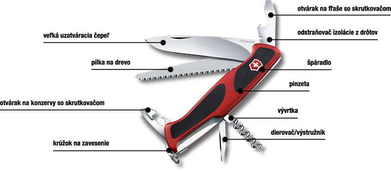 Funkcie | veľký nôž, píla na drevo, vývrtka, otvárač na konzervy s malým skrutkovačom, otvárač na fľaše so skrutkovačom, odstraňovač izolácie z drôtov, dierovač/výstružník, prívesok na kľúče, pinzeta, špáradlo na zuby |